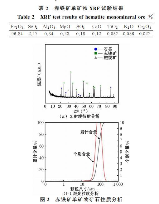 赤鐵礦單礦物則取自某鐵礦廠,將制備后的赤鐵礦樣品進(jìn)行X射線衍射(XRD)分析、X射線熒光光譜(XRF)分析和激光粒度分析,XRD的分析結(jié)果如圖2(a)所示,XRF的分析結(jié)果見表2,粒度分析如圖2(b)所示。從圖2(a)和表2可以看出,F(xiàn)e?O?峰強(qiáng)度最高,含量達(dá)到了96.84%,另外含有少量的氧化物SiO?、Al?O?等。從圖2(b)可以看出,樣品的中值粒徑D??達(dá)到了79.89μm,D??則達(dá)到了123.2μm.綜合上述純度以及粒度,赤鐵礦可滿足后續(xù)單礦物試驗(yàn)的要求。