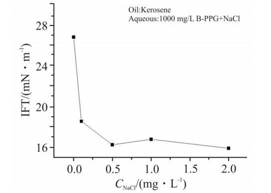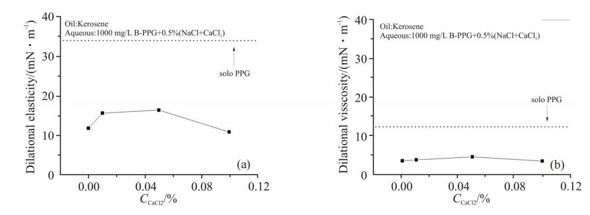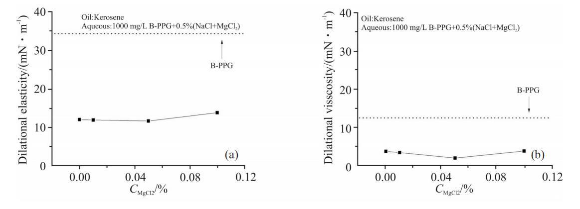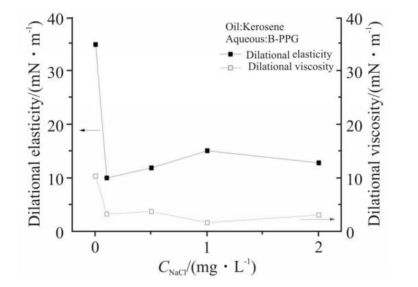 Fig.4為NaCl濃度對1000mg/L的B-PPG溶液界面擴張參數(shù)的影響。由圖可知,加入NaCl后,體系的界面擴張彈性和擴張黏性都明顯下降,擴張彈性降低超過了20mN/m,擴張黏性也由10mN/m左右下降到了5mN/m左右。