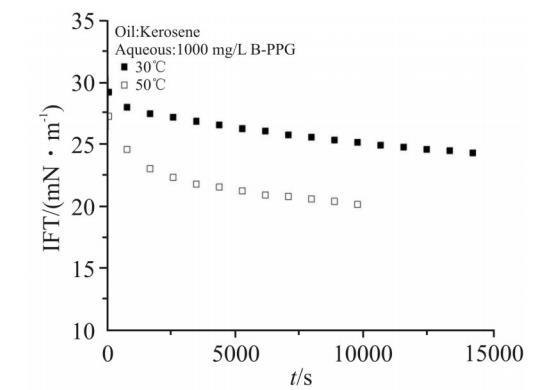 在油田開采過程中,油藏溫度是必須考慮的要素之一。對于分子結(jié)構(gòu)中含聚氧乙烯基團(EO)的表面活性劑,溫度升高會破壞EO與水分子形成的氫鍵,增大表面活性劑的油溶性,對界面張力的影響較大。而對于離子型表面活性劑,溫度對界面張力的影響較小。Fig.8示出了1000mg/L B-PPG溶液在30℃和50℃時的動態(tài)界面張力。由圖可見,在50℃時,體系的界面張力比30℃時降低了5mN/m左右。B-PPG的水溶性很大程度來源于酰胺基團與水分子形成的氫鍵,因此,溫度升高,B-PPG的油溶性增大,界面吸附量有所增加,界面張力明顯降低。