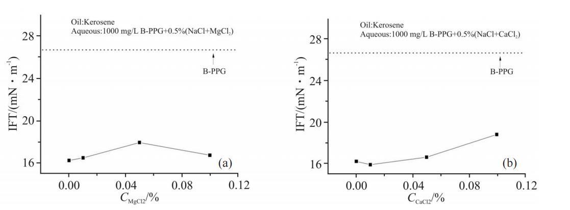 油藏地層水中含有Ca2+,Mg2+等二價陽離子,作為反離子可與B-PPG吸附膜發(fā)生作用,可能有其獨特的行為。固定水相總礦化度為0.5%,改變其中二價陽離子的含量,考察了Ca2+和Mg2+對B-PPG界面膜性質(zhì)的影響。Fig.5所示為二價陽離子濃度對1000mg/LB-PPG溶液界面張力的影響。從圖中可以看出,隨著電解質(zhì)中二價陽離子濃度增大,界面張力均略有升高,其中Ca2+的影響程度略高于Mg2+。從陽離子半徑考慮,Ca2+>Mg2+>Na+,因此,用二價陽離子部分頂替一價陽離子,可能造成界面分子排列的緊密程度有所降低,界面張力略有升高。Ca2+的半徑更大,界面張力的升高趨勢更明顯。
