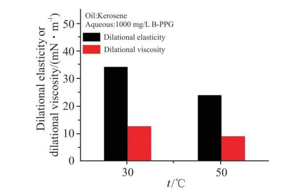 溫度對1000 mg/L B-PPG溶液界面擴張彈性和黏性的影響見Fig.9。實驗結(jié)果表明,當溫度從30℃升高到50℃時,界面擴張彈性和黏性均明顯降低。隨著溫度升高,界面膜變得疏松,同時,B-PPG分子的熱運動加劇,擴散交換過程變快,上述變化均會造成界面膜強度的降低,50℃時B-PPG界面膜的彈性和黏性不到30℃的1/2。