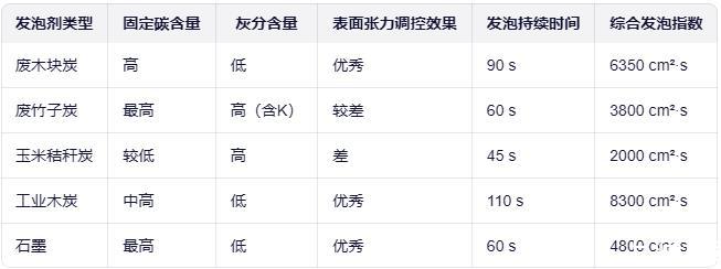 從數(shù)據(jù)可見,廢木塊炭和工業(yè)木炭因固定碳高、灰分低,表面張力調(diào)控能力優(yōu)秀,發(fā)泡持續(xù)時間長,綜合性能突出。廢竹子炭雖固定碳最高,但灰分中高鉀元素導(dǎo)致表面張力變化過快,泡沫穩(wěn)定性下降。