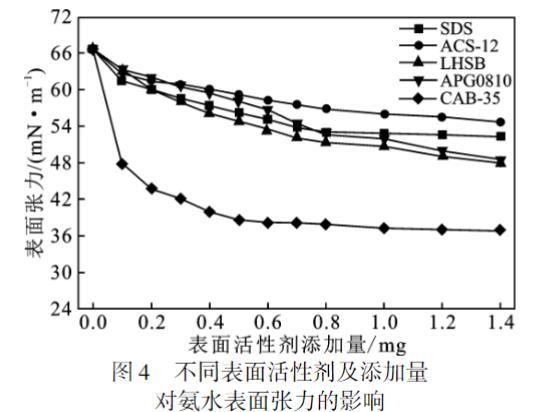 (3)不同含量的SDS、ACS-12、LHSB、APG0810和CAB-35表面活性劑均能使氨水溶液的表面張力顯著下降,其中,同含量下含有CAB-35的氨水溶液表面張力值降幅最大。