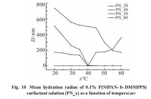 為深入研究P(NIPAN-b-DMMPPS)嵌段聚合物在水溶液中的溫度響應(yīng)特性,本文利用激光納米粒度儀對PN_20,PN_40,PN_50,PN_80和PN_100這5種不同組成的聚合物樣本進行了分析,特別關(guān)注了它們的水合半徑隨溫度變化的情況。測量結(jié)果見Fig.10。