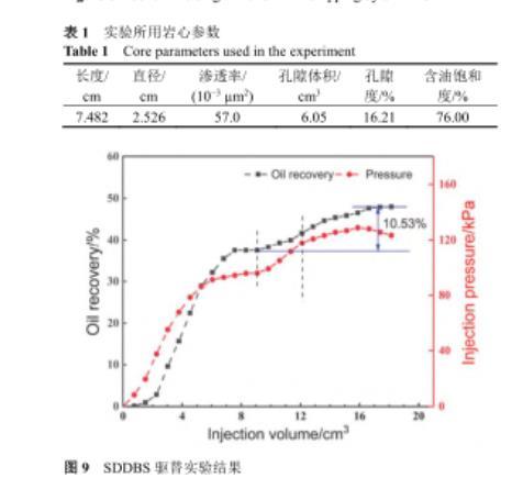 結合上述研究,選取0.02%(w)SDDBS溶液作為驅油劑進行巖心動態(tài)驅替實驗.本實驗使用的巖心參數(shù)如表1所示.驅替實驗共分為三個過程:模擬地層水驅、表面活性劑驅、后續(xù)模擬地層水驅.驅替結果如圖9所示,初期地層水驅,當采出液含水率>98%時,計算采收率為37.36%.當注入3.025 cm3 SDDBS溶液后采收率提高至41.67%,注入壓力升高.恒溫保持12 h后進行后續(xù)水驅,注入壓力逐漸升高,且當采出液含水率>98%時,計算采收率為47.89%.說明SDDBS溶液驅在水驅基礎上提高采收率10.53%,具有優(yōu)異的驅油效果.