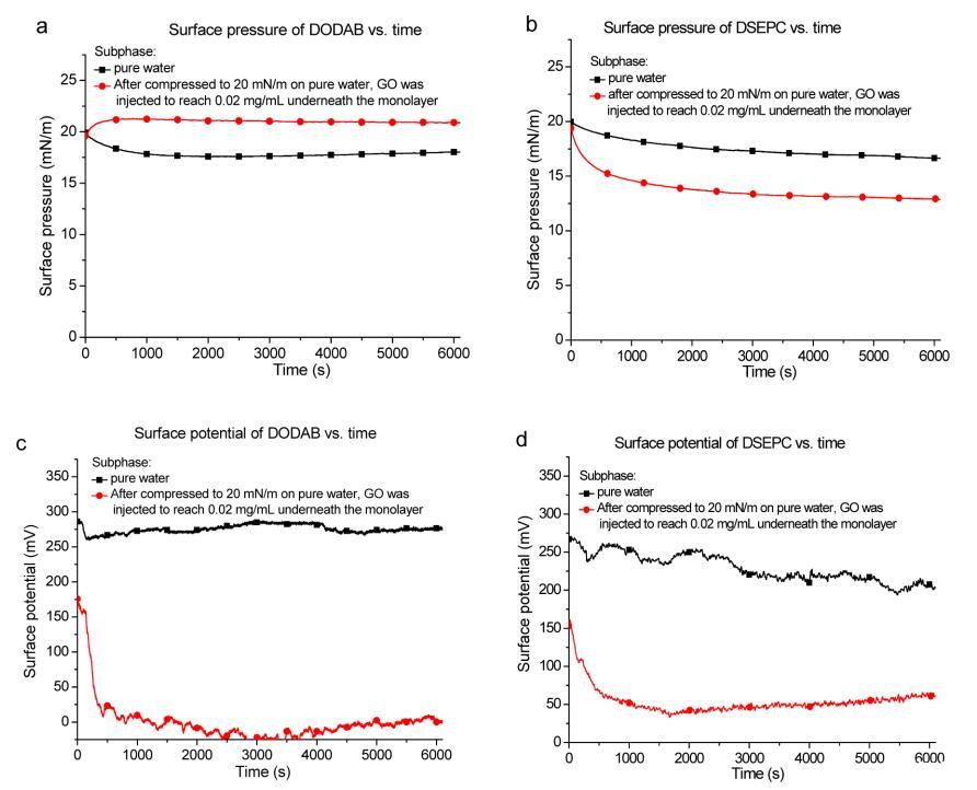 圖 2. (a) DODAB 和 (b) DSEPC 單層的表面壓力與經(jīng)過時間的關(guān)系。 單層的表面電位與經(jīng)過時間的關(guān)系 (c) DODAB 和 (d) DSEPC。 黑色曲線:單層在純水亞相上被壓縮到 20 mN/m 的表面壓力。 紅色曲線: 將單層壓縮至 20 mN/m 后,將 600 μL 1 mg/mL GO 分散體小心緩慢注入單層下方 進入水亞相以達到 0.02 mg/mL 的 GO。