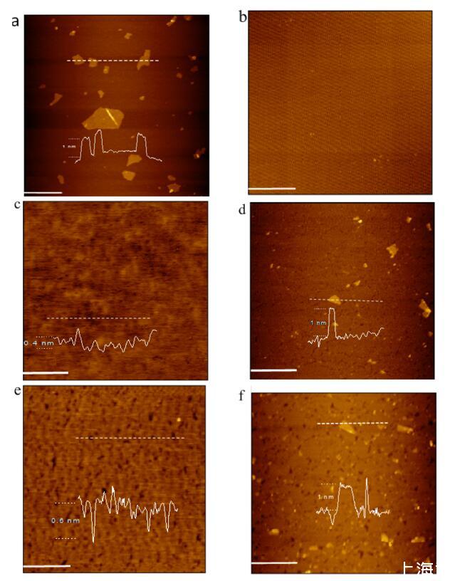 圖 5. 新鮮切割的云母表面上的 AFM 圖像(比例尺 = 1 μm):(a)干燥后的一滴 GO 分散體; (b) LB的對照實驗 在空氣-GO 水界面沒有脂質(zhì)沉積的薄膜; (c) 從空氣-純水界面轉(zhuǎn)移的 DODAB LB 薄膜; (d) LB膜 從空氣-GO水界面轉(zhuǎn)移的DODAB; (e) 從空氣-純水界面轉(zhuǎn)移的 DSEPC LB 薄膜; (f) LB膜 DSEPC 從空氣-GO 水界面轉(zhuǎn)移。 所有脂質(zhì) LB 膜都在 20 mN/m 的恒定表面壓力下轉(zhuǎn)移。