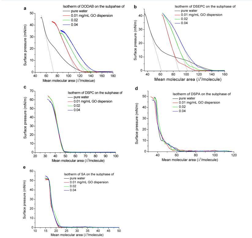 圖 1. 空氣-水或 GO 分散界面處脂質(zhì)的表面壓力-面積等溫線:(a) 帶正電荷的 DODAB; (b) 積極 收費 DSEPC; (c) 帶中性電荷的 DSPC; (d) 帶負電的 DSPA; (e) 帶負電的 SA。 請注意,沒有表面壓力 在空氣-GO 分散界面處檢測到,而沒有在界面處擴散脂質(zhì)。 每個分子軸面積的虛線的截距 表示每個分子的極限面積。