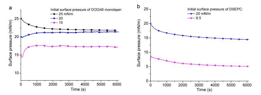 圖 4. GO 在不同表面的 (a) DODAB 和 (b) DSEPC 單層的吸附研究(表面壓力與經(jīng)過時間) 壓力。 單層首先在純水亞相上壓縮到一定的表面壓力,然后 600 μL 1 mg/mL GO 分散體 被小心地緩慢注入單層下方的水亞相中。