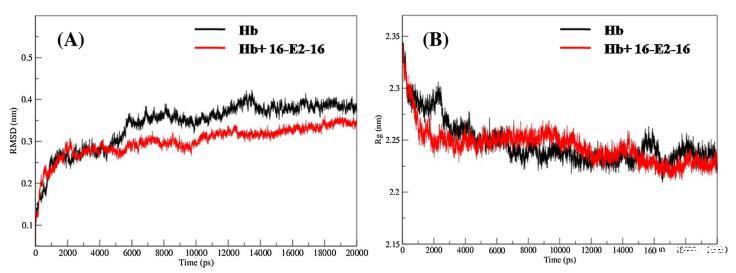 進一步研究16-E2-16的結(jié)構(gòu)穩(wěn)定性影響 結(jié)合Hb,采用分子動力學(xué)模擬。 我們分析了兩者的動態(tài)結(jié)構(gòu)特性,例如均方根偏差 (RMSD) 和回轉(zhuǎn)半徑 (Rg)。 未綁定和 16-E2-16 有界 Hb 使用從獲得的軌跡 MD模擬。