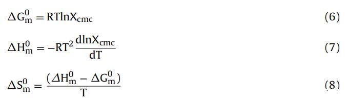 其中αG0m、αH0m和αS0m是自由能、焓的變化 和膠束化熵,Xcmc 是 cmc 處的摩爾分數(shù)。 這 從方程 (6-8) 獲得的值顯示在表 2 中。