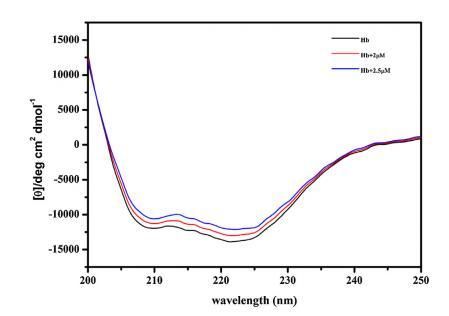 進行CD以進一步確認構(gòu)象變化 由 16-E2-16 引起的 Hb,從而允許進一步評估 Hb 和 16-E2-16 之間的相互作用。 圖 5 顯示了 不存在和存在 16-E2-16 時 Hb 的 CD 光譜。 光盤 Hb 的光譜在 208 nm 和 222 nm 處顯示兩個負最小值, 蛋白質(zhì)α-螺旋結(jié)構(gòu)的特征。 16-E2-16 光學(xué)不活動不顯示任何信號。 在場 在 16-E2-16 中,Hb 的負橢圓度降低,表明 可能形成 Hb/16-E2-16 復(fù)合物 [68]。 α-螺旋 計算了 Hb 及其與 16-E2-16 (2 μM) 復(fù)合物的百分比,發(fā)現(xiàn)分別為 53% 和 47%。 進一步降低 在更高濃度的 16-E2-16 (2.5 μM) 存在下達到 44% 表明 Hb 的 α-螺旋含量明顯降低。 因此, CD 結(jié)果表明存在 16-E2-16 變化 Hb 的二級結(jié)構(gòu)與我們的 計算結(jié)果。