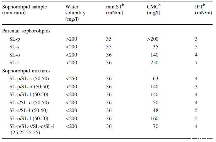4個親代SLs中的每一個都產(chǎn)生了35–36 mN/m的可比最小ST,但CMC值明顯不同(表3)。 SL-p和SL-l的CMC值均大于200 mg/l,而SL-s和SL-o的CMC值分別為35 mg/l和140 mg/l。 IFT值范圍為3 mN/m(SL-p)至7 mN/m(SL-l)。 為了控制SLs的表面活性,以50:50的混合比制備混合物,并重新評估其性能。 各混合物的內(nèi)酯分布見表2。 經(jīng)分析,最小ST和IFT相對不變,但CMC值確實因SL混合物而異。 通過混合獲得了介于48 mg/l和140 mg/l之間的臨界膠束濃度。 有趣的是,CMC值最低的SL混合物都含有SL-s成分。 特別是SL-s的CMC值為35 mg/l; 即使是以25:25:25:25的比例包含所有4種親本SL的混合物,其CMC值(70 mg/l)也比不含SL-s成分的其他混合物低。 這些數(shù)據(jù)表明,SL-s對水的表面活性性能的影響更為顯著。 通過使用較少的SL-s,可以實現(xiàn)相等的最小ST和IFT。 性能控制和高產(chǎn)量將通過降低成本最終有助于SLs的工業(yè)應用。 這些數(shù)據(jù)還指出,通過將不同的SLs混合在一起以獲得所需的性質(zhì),可以在一定程度上控制SLs的表面活性性質(zhì)。 雖然未達到表明這些SLs單獨具有優(yōu)越表面活性劑性能的最低標準,但其性能可能足以允許其作為石化表面活性劑添加劑的使用量增加,以便在大量使用表面活性劑的應用中盡量減少不利的環(huán)境影響。 SL-p和SL-l的CMC值均大于200 mg/l,而SL-s和SL-o的CMC值分別為35 mg/l和140 mg/l。IFT值范圍為3 mN/m(SL-p)至7 mN/m(SL-l)。為了控制SLs的表面活性,以50:50的混合比制備混合物,并重新評估其性能。各混合物的內(nèi)酯分布見表2。經(jīng)分析,最小ST和IFT相對不變,但CMC值確實因SL混合物而異。通過混合獲得了介于48 mg/l和140 mg/l之間的臨界膠束濃度。有趣的是,CMC值最低的SL混合物都含有SL-s成分。特別是SL-s的CMC值為35 mg/l;通過將SL-s與SL-p、SL-o和SL-l以50:50的比例混合,CMC值分別增加到63 mg/l、50 mg/l和48 mg/l。即使是以25:25:25:25的比例包含所有4種親本SL的混合物,其CMC值(70 mg/l)也比不含SL-s成分的其他混合物低。這些數(shù)據(jù)表明,SL-s對水的表面活性性能的影響更為顯著。通過使用較少的SL-s,可以實現(xiàn)相等的最小ST和IFT。性能控制和高產(chǎn)量將通過降低成本最終有助于SLs的工業(yè)應用。這些數(shù)據(jù)還指出,通過將不同的SLs混合在一起以獲得所需的性質(zhì),可以在一定程度上控制SLs的表面活性性質(zhì)。雖然未達到表明這些SLs單獨具有優(yōu)越表面活性劑性能的最低標準,但其性能可能足以允許其作為石化表面活性劑添加劑的使用量增加,以便在大量使用表面活性劑的應用中盡量減少不利的環(huán)境影響。