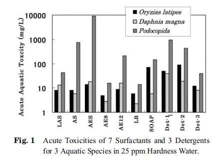 使用3種測(cè)試生物:米齊亞屬latipes、大型水蚤(daphnia magna)和podocopida,測(cè)定了7種表面活性劑和3種商用洗滌劑的急性毒性。 結(jié)果如圖1所示。 在所有情況下,足爪螨的EC50和/或LC50均高于寬脊稻和大型水蚤。 肥皂和LB對(duì)稻瘟病菌的毒力值高于對(duì)大型水蚤的毒力值,而其他5種表面活性劑對(duì)稻瘟病菌和大型水蚤的毒力值幾乎相等。 表面活性劑可分為3類; 低毒組(AES、SOAP和AE12)、中毒組(LAS和AS)和高毒組(AE8和LB)。