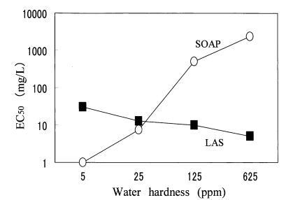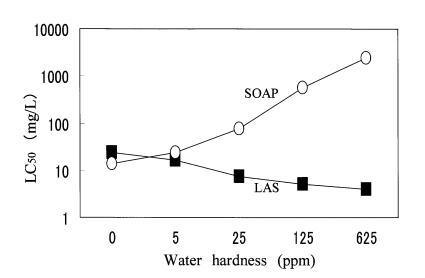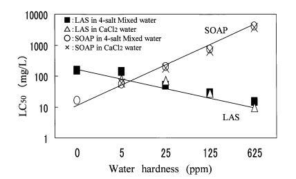 在預(yù)試驗(yàn)中,大型水蚤在4鹽混合溶液中存活,但在CaCl2?H2O溶液或蒸餾水中不能存活。 另一方面,角鯊在所有3種水中都能存活。 因此,使用podocopida研究了水硬度成分對(duì)LAS和肥皂毒性的影響。 如圖3所示,CaCl2?H2O溶液和4-鹽混合溶液的毒性值沒有差異。 肥皂的毒性隨水硬度的增加而降低,LAS的毒性隨水硬度的增加而增加。