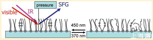 在此,我們研究了光開關(guān)脂質(zhì)DT Azo-5P(圖1)的單層,其為純的,并與脂質(zhì)1,2-二棕櫚酰-sn-甘油-3-磷酸膽堿(DPPC)混合。如圖1中的UV/vis光譜所示,光活性脂質(zhì)可分別用370和450 nm的光從其反式狀態(tài)切換到順式狀態(tài)并返回。我們將表面壓力測量與無標簽、寬帶振動和頻率產(chǎn)生(VSFG)光譜相結(jié)合。10這些技術(shù)使我們能夠研究空氣-水界面上的脂質(zhì)分子單層??梢垣@得有關(guān)脂質(zhì)與水分子相互作用的信息以及脂質(zhì)的分子結(jié)構(gòu)。在非線性光學(xué)技術(shù)VSFG中,紅外(IR)光束和可見光(VIS)光束在界面處組合,產(chǎn)生具有兩個入射光束和頻率的信號。如果紅外線與分子振動共振,信號就會強烈增強。已經(jīng)證明,這種通過分子振動的技術(shù)提供了有關(guān)脂質(zhì)分子構(gòu)象和取向的信息。11-18在中心對稱介質(zhì)中禁止和頻產(chǎn)生,因為這是一種二階非線性光學(xué)過程。19因此,該技術(shù)對中心對稱材料(如水表面)的最外表面分子層敏感。相反,缺少信號表明界面上的材料或分子群是中心對稱的。對于金表面偶氮苯功能化自組裝單分子膜,SFG在測定光異構(gòu)化的截面和機理方面非常有用。得出的結(jié)論是,光異構(gòu)化是由直接電子激發(fā)驅(qū)動的,類似于液相中的偶氮苯