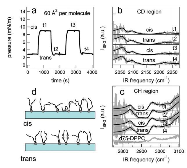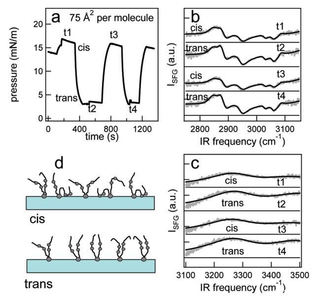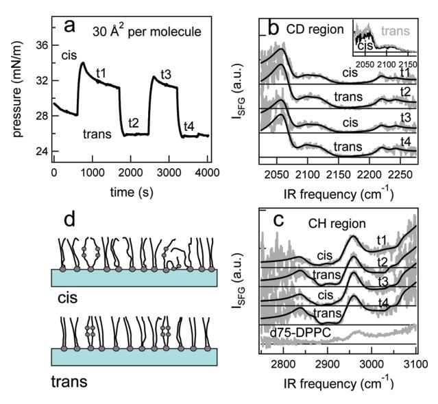 圖6。在脂質(zhì)/H2O界面處,DT Azo-5P/d75 DPPC的1:5混合物的結(jié)果,每個分子的面積為60?2。(a) 表面壓力與時間的關系。用370和450 nm光照射~100秒分別產(chǎn)生順式(高壓)和反式(低壓)狀態(tài)。壓力的微小劇烈波動是由于樣品高度的變化,以校正水的蒸發(fā)。(b) 相應的VSFG光譜(灰色)以及CD區(qū)域的擬合。為了清晰起見,光譜已被抵消。(c) VSFG光譜(灰色)以及用于引導眼睛進入CH區(qū)域的擬合。底部曲線顯示了在P時純d75 DPPC的光譜~ 40百萬/米。(d) 脂質(zhì)尾部方向的示意圖。光開關脂質(zhì)的偶氮苯部分用灰色圓圈表示。