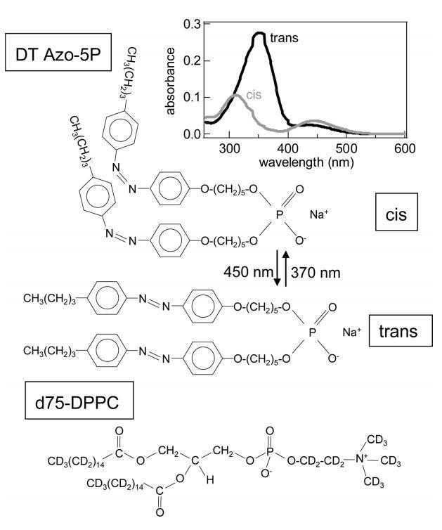 圖1。 順式和反式構型的光開關脂質(zhì)DT Azo-5P和d75 DPPC的分子結(jié)構。 右上角的插圖顯示了CHCl3中DT Azo-5P的紫外/可見光譜( ~ 在370nm(順式狀態(tài))和450nm(反式狀態(tài))下輻照約10s后,使用7μM,1cm的反應杯。