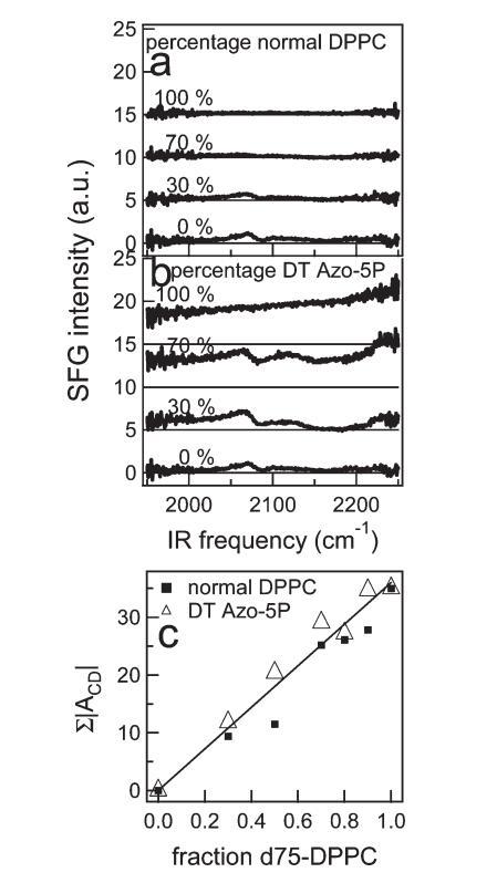 圖9。 (a) 正常DPPC和d75 DPPC不同混合物的CD區(qū)VSFG光譜。 圖中給出了混合物中正常DPPC的百分比。 為清晰起見,光譜偏移,細線表示零。 (b) 與a部分類似,但適用于DT Azo-5P與d75 DPPC的混合物。 (c) 通過擬合文中描述的VSFG光譜獲得的CD振動振幅之和,作為含正常DPPC或DT Azo-5P的二元混合物中分數(shù)d75 DPPC的函數(shù)。 在本實驗中,為了獲得混合物的高質(zhì)量數(shù)據(jù),IR通量很高,導致通過VSFG光譜中相對較高的CH2和CD2振幅觀察到的脂質(zhì)尾部出現(xiàn)小的無序。