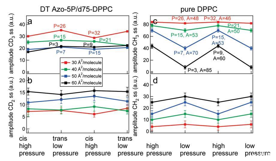 圖8.在d75 DPPC和DT Azo-5P(左)的5:1比率的實驗中,d75 DPPC和純正常DPPC(右)的擬合結(jié)果。(a)CD3對稱拉伸振動模式的振幅作為不同密度的光開關脂質(zhì)狀態(tài)的函數(shù);(b)CD2對稱拉伸振動模式的振幅作為不同密度的光開關脂質(zhì)狀態(tài)的函數(shù);右圖顯示了純DPPC的類似結(jié)果,壓力與左圖相似,其中(c)CH3對稱拉伸振動模式的振幅和(d)CH2對稱拉伸模式的振幅。共振的寬度和頻率在擬合中是固定的。