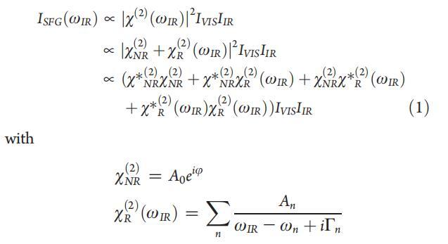 共振項振幅的相對符號取自文獻。12,27,28擬合結(jié)果如圖3中黑色所示。事實上,擬合顯示DT Azo-5P的非共振振幅比通常觀察到的脂質(zhì)單層(如DPPC)的非共振振幅大3倍(見下文)。圖3a中的黑色虛線曲線說明了對信號的較大非共振貢獻的影響,該曲線表示使用DT Azo-5P共振響應(從擬合結(jié)果獲得)的計算頻譜,但非共振振幅設置為零(水振幅被設置為零,從零開始,尾巴在CH區(qū)域也充當NR信號)。當NR振幅設置為零時,我們不僅觀察到背景降低,而且還觀察到視共振信號大小減小了2到5倍,具體取決于紅外頻率。通過測量羅丹明6G的VSFG光譜,我們觀察到了由于電子躍遷而產(chǎn)生的類似信號增強。29,30然而,在這種情況下ase作者使用可見光與電子激發(fā)共振,因此他們進行了雙共振實驗。對于DT Azo-5P,在800 nm處沒有電子躍遷,因此沒有雙共振效應;增強完全是非共振的。因此,對于目前的系統(tǒng),非共振信號外差共振由χNR(2)和χR(2)的交叉項引起的nt信號(見等式1最后一行中的第二項和第三項),并增強信號而不是影響χR(2)如羅丹明6G.29,30所直接得出的結(jié)論,外差效應因此不僅是分子內(nèi)的,而且是分子間的,并且可以直接用于增強高稀釋樣品中的低信號,例如,通過簡單地將含苯部分添加到單層中。這意味著VSFG光譜中的信號大小是在這種情況下,并不像在大多數(shù)非共振貢獻非常小的情況下那樣簡單地依賴于分子數(shù)量。在附錄中,我們證明,由于外差效應,在存在光脂的情況下,可以測量相對較低水平的DPPC。這種非共振外差效應可能提供一種有用的去共振方法檢測分子單層中低濃度分子的振動響應。