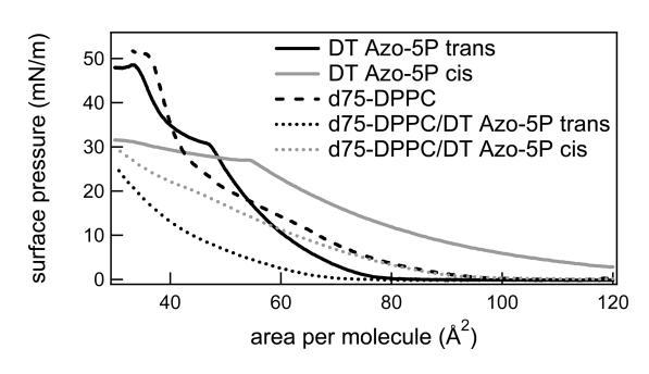 圖2。反式和順式狀態(tài)下的光開關脂質(zhì)DT Azo-5P(實線)、d75-DPPC(虛線)以及光開關兩種狀態(tài)下的1:5摩爾比的光開關脂質(zhì)和d75-DPPC(虛線)的表面壓力與面積等溫線。