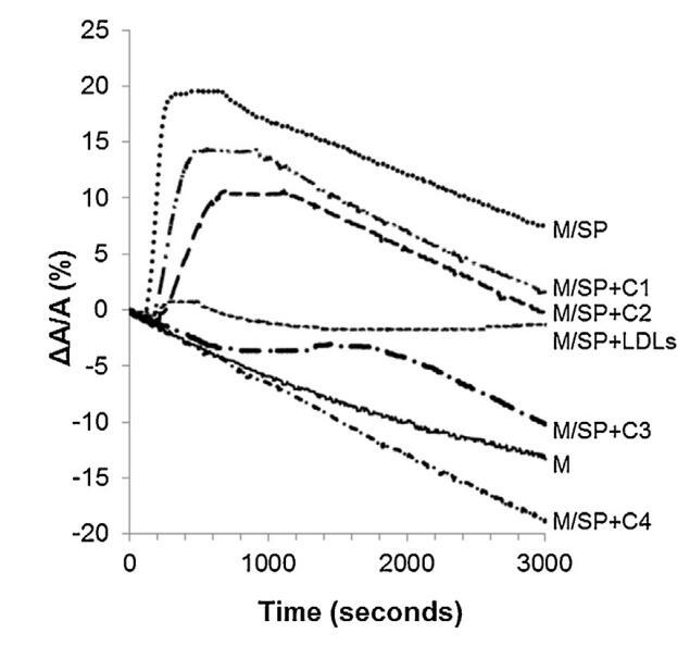 圖5。注入(…)后,由單層(M)覆蓋并在不含(-)額外分子的緩沖液上形成的界面的相對(duì)表面積隨時(shí)間的變化SP(26.6±1.5 mg蛋白質(zhì))、SP(26.6±1.5 mg蛋白質(zhì))和不同濃度(··-)C1、(·-)C2的脂質(zhì)體的混合物,(·-)C3和(·-)C4(分別為1.17±0.02 mg、2.18±0.02 mg、4.37±0.02 mg和6.55±0.02 mg脂質(zhì))和(---)LDL(4.6 mg PC)和SP(26.6±1.5 mg蛋白質(zhì))的混合物??諝?緩沖界面處的溫度為34℃。表面壓力保持在25 mN/m。