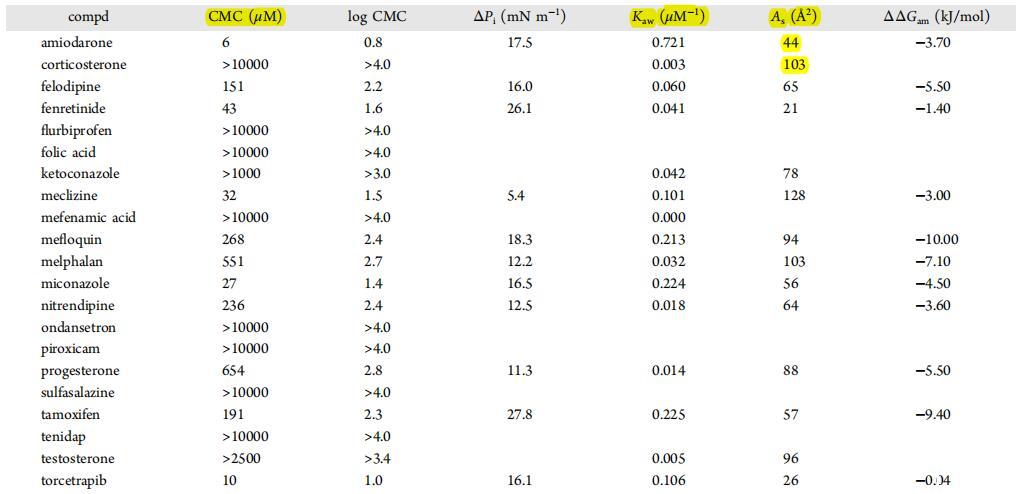表面活性測定?;衔镌贒MSO中連續(xù)稀釋超過12種不同濃度,并在pH值為6.5的0.05 M磷酸鹽緩沖液中添加至最終10%的DMSO含量。最終化合物濃度默認(rèn)范圍為10 nM至10 mM。在第二次實驗中,對于達(dá)到溶解度極限或需要對相關(guān)濃度范圍進(jìn)行解析以確定最佳參數(shù)的情況,定義了替代濃度范圍。樣品靜置10分鐘,以便在液體中平衡?空中接口。表面壓力分布在張力計(MultiPi WS1,Kibron Inc.,芬蘭赫爾辛基)上進(jìn)行,通過之前的測量(72.8 mN/m)對50μL等份樣品進(jìn)行校準(zhǔn)。通過對生成的等溫線進(jìn)行曲線擬合確定表面活性參數(shù),并根據(jù)經(jīng)典的空氣吉布斯熱力學(xué)理論進(jìn)行計算?水里,臉上。主要導(dǎo)出參數(shù)如下。(i)考:空氣?水分配系數(shù),來自等式2