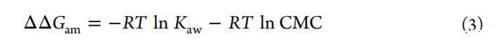 式中,π對應(yīng)于表面壓力,C對應(yīng)于化合物濃度。(ii)CMC:對應(yīng)于最大表面壓力下平臺截距和曲線外推斜率的臨界膠束濃度(?π/?lnc)處于拐點(diǎn)(圖3)。(iii)ΔΔGam:式3中的兩親性