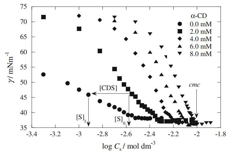 圖2界面張力γ與對(duì)數(shù)Cs/mol dm的曲線圖?不同α-CD濃度下Mega-10+DPS混合系統(tǒng)的α-DPS的3=0.80