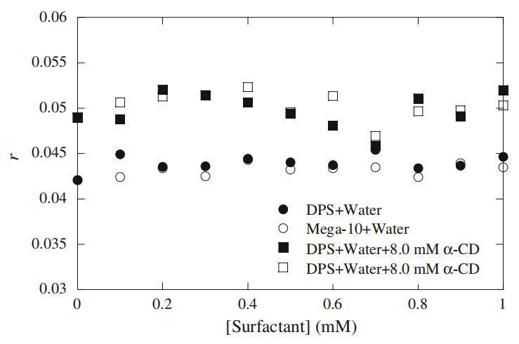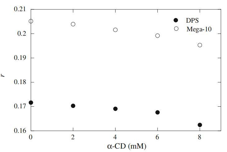 在這項(xiàng)工作中,我們研究了RB與表面活性劑-α-CD-水三元體系的詳細(xì)相互作用,以便系統(tǒng)地研究RB的極化行為。在進(jìn)入膠束介質(zhì)之前,我們排除了RB與水溶液和水溶液α-CD介質(zhì)中前冰層表面活性劑濃度(1 mM)的結(jié)合行為。圖10顯示了在冰層前表面活性劑濃度下,Mega-10和DPS的RB各向異性行為。在水中和存在α-CD(8mm)的情況下,我們未觀察到表面活性劑RB的右旋值有任何顯著變化。從圖10獲得的結(jié)果意味著探針RB不與表面活性劑單體、環(huán)糊精和α-CD表面活性劑包合物結(jié)合。在這些初始測(cè)量之后,我們將我們的實(shí)驗(yàn)方法擴(kuò)展到膠束介質(zhì),以觀察RB的各向異性行為。圖11顯示了純表面活性劑以及Mega-10和DPS二元混合物(15mm)的α-CD(2-8mm)依賴性各向異性行為。從圖11可以得出一些有趣的結(jié)論。首先,圖11清楚地表明,在水介質(zhì)中,純Mega-10的膠束比DPS的膠束具有更高的微粘度。這種行為可以用表面活性劑分子在膠束中的堆積排列來(lái)解釋,表明Mega-10膠束中的堆積比DPS膠束中的更緊密。對(duì)于二元混合物,r值隨著DPS(αDPS)摩爾分?jǐn)?shù)的增加而減小,這表明DPS被誘導(dǎo)到混合膠束中產(chǎn)生的剛性結(jié)構(gòu)較低(參見(jiàn)圖11中最左邊的圖例)。其次,在DPS的每摩爾分?jǐn)?shù)下,r值隨α-CD濃度的增加而線性減小。盡管隨著α-CD濃度的增加,在αDPS=0.0時(shí),r值的下降更為瞬時(shí)。我們注意到,r值的瞬時(shí)降低是由于膠束濃度的降低。為了證實(shí)這一結(jié)果,我們?cè)?0 mM濃度下對(duì)αDPS=0.0(即Mega-10)進(jìn)行了各向異性測(cè)量,圖12中繪制了Mega-10的觀測(cè)r值,并與15 mM濃度下的αDPS=1.0(即DPS)進(jìn)行了比較。正如我們所見(jiàn),隨著α-CD濃度的增加,Mega-10(20 mM)的r值沒(méi)有瞬時(shí)下降,這表明圖11中r值的急劇下降是由于膠束濃度的降低。DelaCruz等人研究了RB衍生物與陰離子、陽(yáng)離子和非離子表面活性劑的相互作用,并得出結(jié)論,RB衍生物的酯鏈的電荷和長(zhǎng)度控制著與不同膠束系統(tǒng)的相互作用[35]。