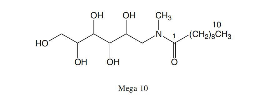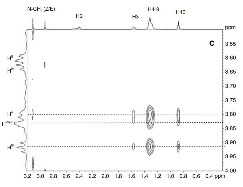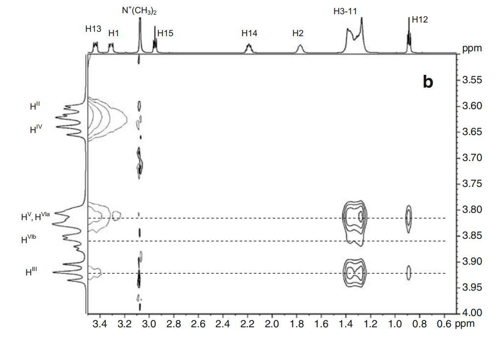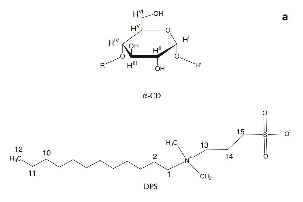 圖7a顯示了α-CD、DPS和Mega-10的示意圖,以簡(jiǎn)化表面活性劑原子與CD原子的相互作用。2DROESY數(shù)據(jù)證明表面活性劑的烷基鏈包含在α-環(huán)糊精的疏水腔中。光譜如圖7b和c所示??梢钥吹奖砻婊钚詣┕舱衽c位于環(huán)糊精空腔內(nèi)的HIII、HV和HVI共振的交叉峰。未觀察到分子(HI、HII和HIV)外部與環(huán)糊精原子的相互作用。對(duì)于這兩種表面活性劑,與HIII和HV的相互作用似乎覆蓋了從末端甲基到H3的整個(gè)烷基鏈。這意味著幾個(gè)不同的復(fù)雜幾何形狀和穿透深度之間的快速交換。在鎘原子和親水性頭基之間沒(méi)有觀察到相互作用。