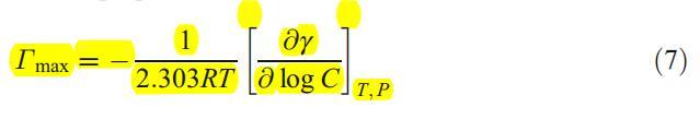 根據(jù)γ與log Cs/mol dm的曲線圖?3,我們?cè)u(píng)估了純表面活性劑和混合表面活性劑在空氣-水界面上的界面吸附參數(shù),在沒(méi)有和存在不同的α-CD濃度的情況下。表面活性劑在cmc下的表面過(guò)量值Γmax表示表面活性劑在空氣-水界面上的吸附量。稀溶液的表面過(guò)剩值可根據(jù)吉布斯方程確定,如下[27]: