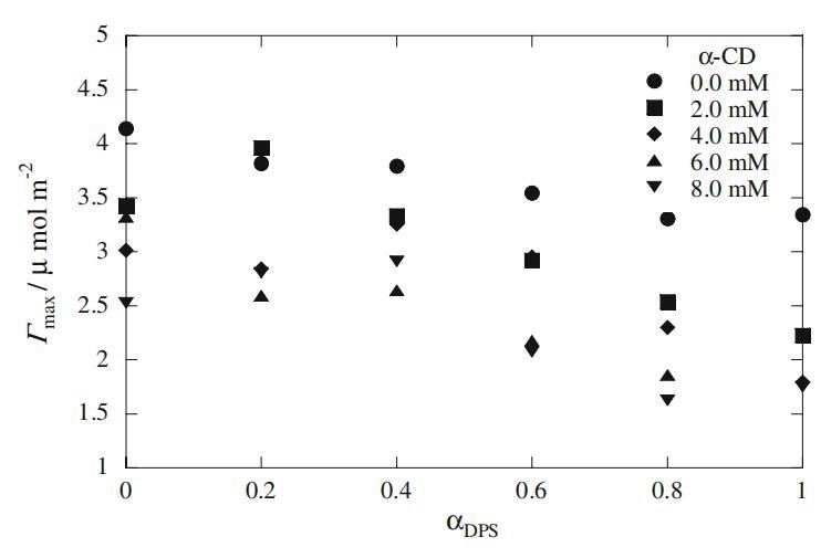 式中,γ、C、R、T和P為界面張力、表面活性劑濃度、理想氣體常數(shù)、溫度和壓力。純系統(tǒng)和混合系統(tǒng)的Γmax值如圖4所示。純Mega-10和DPS分子的Γmax值與文獻(xiàn)報(bào)道的值一致[26,28]。圖4顯示Mega-10的Γmax值略高于DPS。這一結(jié)果表明,與DPS相比,Mega-10分子在空氣-水界面以更緊湊的形式排列。兩種表面活性劑的Γmax值隨著α-CD量的增加而減小,表明表面活性劑物種從界面上的解吸(圖4)。這種行為是表面活性劑與α-CD之間存在相互作用的另一個(gè)證據(jù)。對(duì)于Mega-10和DPS在不同DPS摩爾分?jǐn)?shù)(αDPS)下的二元混合物,Γmax值隨著DPS量的增加而減小,表明DPS在界面上吸附后形成混合單層。