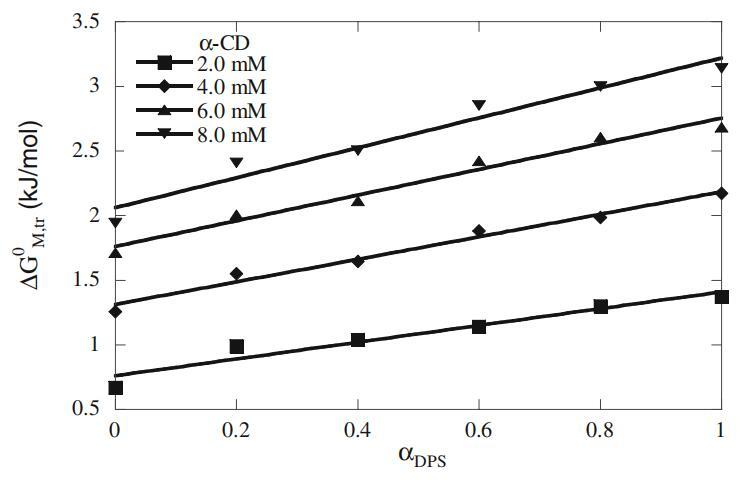 根據(jù)cmc值,我們?cè)u(píng)估了純表面活性劑系統(tǒng)和混合表面活性劑系統(tǒng)在不存在和存在α-CD的情況下的膠束化標(biāo)準(zhǔn)自由能(數(shù)據(jù)未顯示)[27],隨后,通過(guò)膠束轉(zhuǎn)移標(biāo)準(zhǔn)自由能評(píng)估添加劑對(duì)膠束化的影響(?GM,tr 0),從水相到含有α-CD的水相[19]。這些值如圖5所示,在不同α-CD濃度下,在整個(gè)DPS摩爾分?jǐn)?shù)范圍內(nèi)為正值,表明α-CD的存在使膠束形成不利。此外,這些值隨著α-CD濃度的增加而線性增加,在高α-CD濃度下斜率更高,表明混合膠束的形成延遲。
