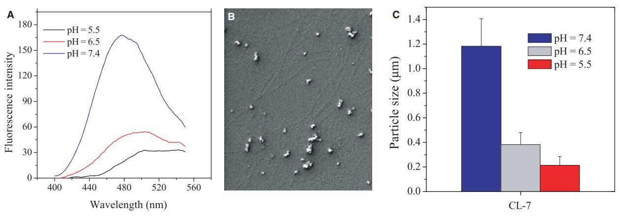 圖6:(A)pH值影響不同pH值下溶液(40 lM)中CL-7的聚集。1-苯胺基萘-8-磺酸(1,8-ANS)濃度固定在20 lM,激發(fā)波長設置為369 nm。肽聚集溶解通過1,8-ANS發(fā)射峰在500 nm處的紅移和熒光強度降低來指示;(B)pH=7.4的40 lM肽溶液中形成的CL-7聚集體的掃描電子顯微鏡圖像;(C)隔夜培養(yǎng)后測量溶液中肽CL-7(80 lM)的粒徑。數(shù)據代表至少三個獨立測試的平均值和標準差。