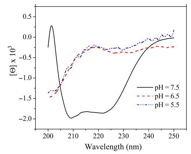 除了肽聚集狀態(tài)外,細胞表面pH值也可能影響pH敏感肽的二級結構。已經發(fā)現(xiàn),肽插入細胞膜通常伴隨著肽二級結構的變化(17)。肽鏈折疊成特定構象,通常為α螺旋結構,這被證明是肽插入細胞膜的必要過程(6)。盡管所有選定的pH敏感裂解肽在生理pH下均采用螺旋結構,但當環(huán)境pH降至肽的過渡pH以下時,它們變成隨機線圈(表2和圖7)。從無規(guī)螺旋轉變?yōu)槁菪请牟迦肽さ哪芰坑欣^程(6)。因此,細胞表面pH值也可能通過改變pH敏感肽的二級結構而影響其活性。