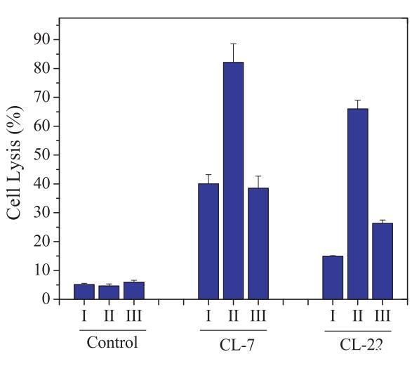 圖4:在CHO-K1細胞(I)、用8-CPT-cAMP處理的CHO-K1細胞(II)和用8-CPT-cAMP處理的CHO-K1細胞上測試的細胞表面pHs調節(jié)PH敏感裂解肽CL-7和CL-22的細胞裂解活性,然后是巴絲霉素A1(III)。表3提供了不同處理對應的細胞表面pHs。在所有實驗中,肽濃度固定在40 lM。對照組未添加肽。對照空白對照組和100%裂解對照組,將細胞裂解(乳酸脫氫酶釋放)標準化為細胞死亡百分比。數(shù)據代表至少三個獨立測試的平均值和標準差。