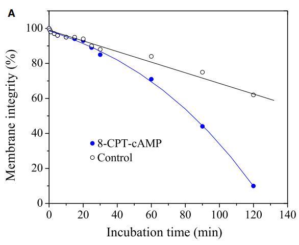 肽與細胞膜的相互作用包括三個步驟:(i)陽離子肽對細胞表面的靜電吸引;(ii)肽向結合平面的轉變;(iii)將肽插入細胞膜。通過研究pH敏感肽CL-7誘導的膜損傷動力學,研究了肽-細胞相互作用的細節(jié)(圖5A)。CL-7誘導的A549細胞膜滲漏呈時間依賴性,并呈線性曲線。盡管在8-CPT-cAMP處理的A549細胞上,CL-7介導的細胞膜損傷在開始時遵循相同的曲線,但它偏離了線性曲線,并在培養(yǎng)15-20分鐘后加速(圖5A)。在脂質單層膜上進行的平行膜張力研究表明,CL-7與細胞膜的相互作用以表面張力快速增加的初始階段為特征,隨后是表面張力松弛的第二階段(圖5B),與肽與膜結合和肽插入相關膜,分別。盡管CL-7與脂膜結合是一個快速過程(3-5分鐘),但肽插入脂膜大約需要20分鐘才能完成。這兩個實驗的結果非常吻合,這意味著細胞表面pH對CL-7的顯著影響發(fā)生在肽-細胞相互作用的后期,即肽插入細胞膜。
