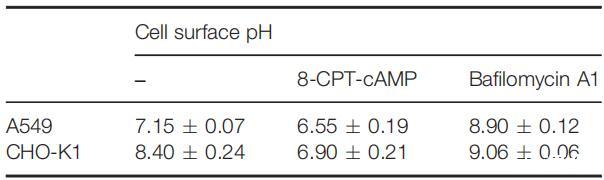 表3:8-CPT-cAMP-和巴非霉素A1在具有生理pH的培養(yǎng)基中誘導的細胞表面pH變化