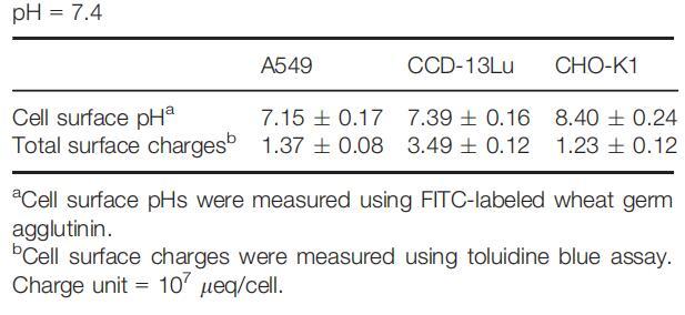 雖然細胞外環(huán)境通過影響細胞表面和整體溶液之間的質子交換而影響細胞表面pH值,但在pH值固定的生理條件下,細胞表面pH值將由細胞的化學和生物學特性決定,包括細胞的質子生產能力、細胞大小、細胞的大小、細胞的大小、細胞的大小、細胞的大小、細胞的大小、細胞的大小、細胞的大小、細胞的大小以及細胞的大小,以及細胞表面的pH緩沖能力。因此,在生理條件下,組織細胞可能具有特定的甚至可區(qū)分的表面pHs。我們測量了一組來自不同器官/組織的細胞在生理pH下的細胞表面pH值,發(fā)現(xiàn)所有受試細胞都具有不同的表面pH值(表1)。