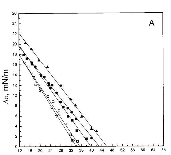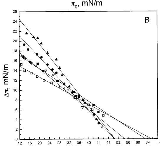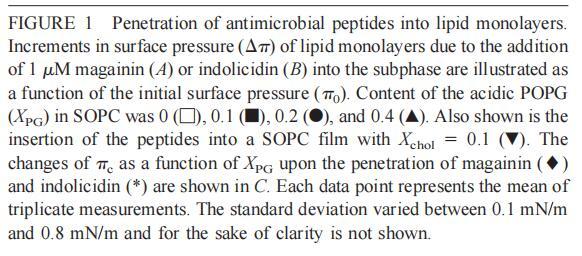 通過測量表面壓力的增量,觀察到抗菌肽在不同初始表面壓力(π0)下嵌入到空氣/水界面上的脂質單層中(?π)將肽添加到亞相后(Brockman,1999;Verger和Pattus,1976)。Magainin 2在π0>12 mN/m時容易插入SOPC單層(圖1A),而在π0以上≈35 mN/m時,其在膜中的滲透被消除,因此該值表示該肽與SOPC膜相互作用的臨界包裝壓力πc。根據其凈正電荷4(Matsuzaki,1998),當膜中酸性磷脂POPG的含量增加時,magainin 2向脂質單層的滲透逐漸增強(圖1 A)。因此,消除magainin 2插入單層的πc值增加至~39(XPG=0.1)、43(XPG=0.2)和46 mN/m(XPG=0.4)(圖1c)。相反,在SOPC膜中加入膽固醇(Xchol=0.1)對magainin 2的滲透沒有顯著影響(圖1A)。