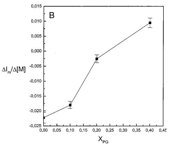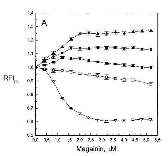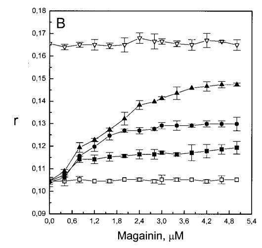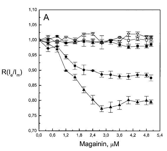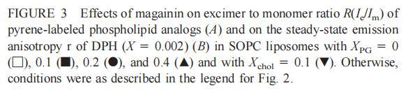 有趣的是,在存在酸性磷脂的情況下,肌動蛋白/脂質的摩爾比(在該摩爾比下,肌動蛋白的初始增量趨于穩(wěn)定)分別為1:21、1:16和1:12.5,對應于XPG=0.1、0.2和0.4(圖2A),分別產生1:2、1:3和1:5的肌動蛋白/磷脂化學計量比。同時,DPH的初始r增量在magainin/脂質摩爾比為~1:30、1:12和1:5時趨于平穩(wěn)(XPG分別為0.1、0.2和0.4),對應于大約1:3、1:2.5和1:2的magainin/PG化學計量比(圖3)。據報道,在這些肽/脂質摩爾比下,magainin可插入含酸性磷脂的膜中(Ludtke等人,1994年)。此外,已經證明,雙分子層中magainin的=-螺旋的方向取決于肽與脂質的摩爾比,在上述化學計量比下,螺旋應垂直于膜表面插入,在含PG的膜中形成孔(Ludtke等人,1996)。這些孔不僅由兩親螺旋的極性面組成,而且還由脂質的極性頭基組成,內外單層通過這些孔襯脂質是連續(xù)的。膜中的這種結構可能會降低探針芘部分微環(huán)境的極性,從而提高其量子產率。有趣的是,當XPG>0.1時,magainin 2逐漸降低Ie/Im值(圖3 A),這與增強的酰基鏈順序減少脂質側向擴散的速率一致。然而,由于magainin 2已經在XPG=0.1時增加了r,Ie/Im沒有變化,我們可以得出結論,PPDPG探針向微區(qū)富集以及其橫向擴散的減少正在發(fā)生。