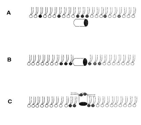 對于測試的所有單層組成,吲哚青霉素的πc值超過了馬蓋寧2的測量值(圖1 c),表明該肽在?;溨g有效插入和插層。吲哚西丁在~38 mN/m的交叉點值得關注。在后一個表面壓力之下,表面壓力的增量??在PG存在的情況下,吲哚西丁引起的反應增強,而在較高的初始脂質堆積密度下觀察到相反的反應。有趣的是,不管脂質成分(即PG的存在)如何,交叉點幾乎保持不變,因此表明它可以完全由表面壓力決定,而不管靜電相互作用如何。一種可能的機制是,在π0>38 mN/m時,吲哚西丁以壓力依賴的方式改變其在單層中的取向,可能是從其長軸相對于層平面的平行到垂直取向(圖9,B和C),從而減少面積/肽并減少?π.此外,一些靜電結合吲哚肽的PG分子也可能與單層中的磷脂方向不同。換句話說,吲哚西丁與其相關的PG將形成一種超分子復合物,其取向將取決于壓力。這在圖9中示意性地示出。重要的是,所提出的肽連接磷脂的重新定向將與最近提出的模型兼容,在該模型中,穿過雙層的孔表面的一部分將由脂質頭基構成(Ludtke et al.,1996)。