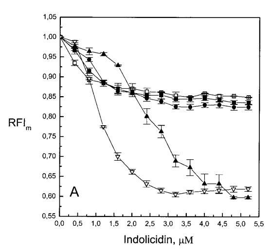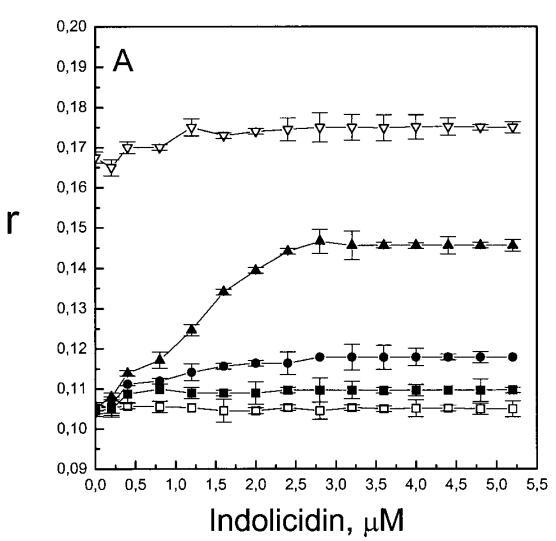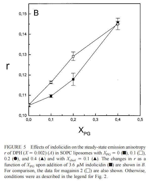 雖然熒光光譜顯示,馬蓋寧2和吲哚西啶對脂質動力學的影響存在明顯差異,但也存在一些明顯的相似之處。因此,DPH各向異性r的增加表明,在存在酸性磷脂的情況下,這兩種肽都會導致?;滍樞虻脑黾?,這種影響的程度隨著XPG的增加而增加(圖3b和5b)。同樣,在膽固醇存在的情況下,兩種肽對芘熒光的有效猝滅也很明顯(圖2a和4a)。這可能與膽固醇的OH基團和馬蓋寧的E19殘基之間的相互作用有關(Tytler等人,1995年),該肽在膜中具有跨膜取向。當Xchol=0.1時,r值的增加是由于吲哚西丁所致,而馬加寧則無影響。這表明,在膽固醇存在的情況下,吲哚肽可能采用跨雙層取向,其長軸垂直于雙層平面。