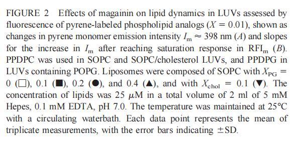 繼上述單層研究之后,有興趣探索肽對脂質動力學的影響。這是通過使用熒光光譜和不同脂質成分的LUV完成的,記錄芘標記的熒光磷脂類似物PPDPC或PPDPG的發(fā)射光譜(均為X=0.01)。對于SOPC LUV,添加magainin 2導致芘熒光顯著猝滅,芘單體和準分子發(fā)射強度平行降低,如Im所示(圖2)。作為XPG的一項功能,還研究了馬蓋寧2與脂質體結合的后果。當XPG從0.1增加到0.4時,觀察到由于magainin 2在398 nm處逐漸增強的Im(RFIm),而Im的初始增量在明確定義的PG/magainin 2化學計量比~2、3和5時趨于平穩(wěn)(圖2 A)。在這個初始階段之后,直到給定的化學計量比,還有第二個過程,其斜率也隨著XPG的增加而增加(圖2b)。在XPG=0和0.1時,Magainin 2僅引起Ie/Im的輕微變化,而在XPG=0.2和0.4時,分別減少10%和25%是明顯的(圖3 A)。為了區(qū)分脂質動力學中兩種性質不同的變化,即側向遷移率和微結構域形成,作為上述Ie/Im變化的根本原因,我們還通過測量DPH的熒光各向異性r來評估?;滍樞虻淖兓▓D3 B)。在缺乏酸性磷脂的情況下,Magainin 2幾乎不會引起r的變化(圖3B)。然而,隨著XPG的增加,加入magainin 2后脂質堆積和?;滍樞蛑饾u增加(圖3b),XPG=0.4時,r最大增加1.4倍。值得注意的是,XPG=0.1時Ie/Im沒有變化以及酰基鏈順序的增加表明PPDPG正在發(fā)生微觀富集。有趣的是,在存在膽固醇(Xchol=0.1)的情況下,由于馬蓋寧2的作用,Im和Ie都顯著降低,Ie/Im的變化不顯著(圖2A和3A)。如前所述(van Ginkel et al.,1989),添加肽前r的增加(圖3 B)揭示了通過在膜中摻入膽固醇而增強的膜順序。然而,在膽固醇存在的情況下,magainin 2對r沒有進一步的影響(Xchol=0.1,圖3b)。