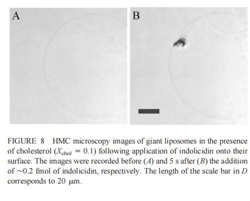 隨后,我們研究了吲哚西丁對由SOPC和膽固醇組成的巨大脂質體(Xchol?0.1)的影響。吲哚西丁在膽固醇存在的情況下也會引起巨大脂質體的起泡。形成的內吞小泡在巨大小泡的表面上深度聚集(圖8b)。具體地說,在添加約0.2 fmol吲哚西啶(~400 fl,20次注射,圖8 B)后約5 s內,巨大脂質體表面出現一簇小顆粒。隨后,聚集物轉移到巨大的脂質體中,同時也有少量內吞顆粒(θ≈0.9米)處可見。進一步添加吲哚西丁會增加這些顆粒的數量,并導致巨大脂質體收縮。然而,即使在暴露于~2 fmol吲哚西?。?00次注射,數據未顯示)的情況下,膜大體上仍保持完整。