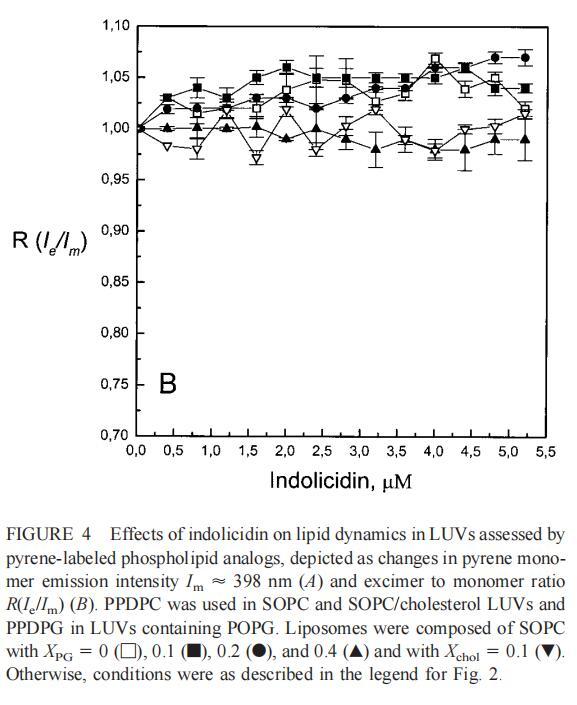 這兩種抗菌肽對芘標記的磷脂類似物的猝滅機制令人感興趣??赡苌婕唉?陽離子相互作用(Dougherty,1996),后者由肽的堿性殘基表示。吲哚西丁具有較高的Trp含量(39%),可促進其分配到脂質雙層(Wimley和White,1996)。因此,芘和色氨酸之間的π-相互作用也是可能的。已經證明,色氨酸可以淬滅膠束溶液中各種芘衍生物的熒光發(fā)射(Encinas和Lissi,1986;Altamirano等人,1998)。另一種可能性是鏈反轉(Holopainen et al.,1999),通過肽與脂質雙層結合,導致芘部分調節(jié)到更極性的環(huán)境中,從而增加熒光團微環(huán)境的極性,并導致量子產率降低。