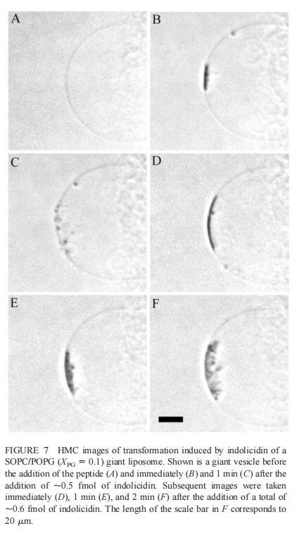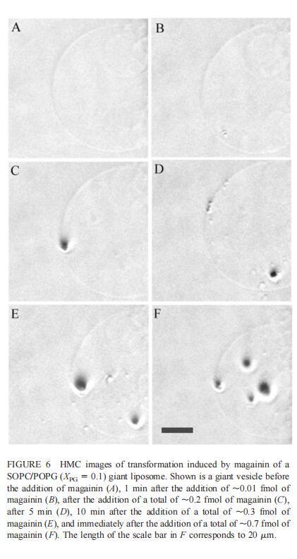 由于上述magainin 2和吲哚西啶對單層和LUV具有明顯的脂質成分依賴性作用,因此有興趣使用巨型脂質體比較這些肽對宏觀膜的三維拓撲結構的影響,無論是否含有PG,都可以在交流電場中形成由SOPC組成的巨大脂質體。即使暴露于大量肽(~2 fmol,~4 pl=200次重復注射,數據未顯示),SOPC膜也不受magainin 2的影響。同樣,由SOPC和膽固醇(Xchol=0.1)組成的巨大脂質體也不受此量的馬蓋寧2的影響(數據未顯示)。然而,在存在POPG(XPG=0.1)的情況下,已經~0.01 fmol(單次~20 fl注射)的magainin 2應用于巨大囊泡表面,顯著影響巨大脂質體膜的拓撲結構(圖6 B)。更具體地說,在~1分鐘內,小顆粒(θ≈0.9米)出現在巨大的囊泡內。隨后注射高達~0.1 fmol(約200 fl)的magainin 2不會引起進一步的可見變化。在總共添加約0.2 fmol的肽后,膜開始起伏,形成致密顆粒(θ≈4 m)在巨大脂質體內可見(圖6 C)。在~5分鐘內,幾個小顆粒(θ≈0.9 m)出現在巨大脂質體膜的內表面(圖6 D)。隨后,大多數小顆粒進入巨大囊泡的內腔。這些內吞小泡似乎在巨大脂質體內自由移動,在隨后30分鐘的觀察中沒有進一步的變化。進一步注射magainin 2,提供總共0.3 fmol的肽,引起類似內吞作用的過程,出現直徑約8 m的致密顆粒(圖6 E)。約10分鐘后,巨大脂質體內約0.9-m顆粒的數量繼續(xù)增加。偶爾,這些顆粒也出現在巨大囊泡的外表面,并釋放到外部緩沖液中(圖6 E)。隨后添加magainin 2(~0.7 fmol)使膜不穩(wěn)定并誘導進一步的囊泡形成(圖6 F)。這些內吞囊泡在巨大脂質體內彼此分離,巨大囊泡的大小明顯減?。▓D6f)。最終,在進一步添加magainin 2(高達~1.5 fmol)后,巨大的脂質體膜崩塌。上述形態(tài)學變化具有高度的可重復性。