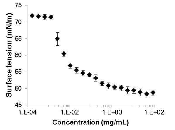 圖2。牛精漿溶液在空氣-水界面的表面張力(±標(biāo)準(zhǔn)偏差),與提取物中所含蛋白質(zhì)的濃度有關(guān),并以對(duì)數(shù)標(biāo)度表示(T=23.2?C±0.3?C、n=2,每個(gè)樣品重復(fù)4次)。